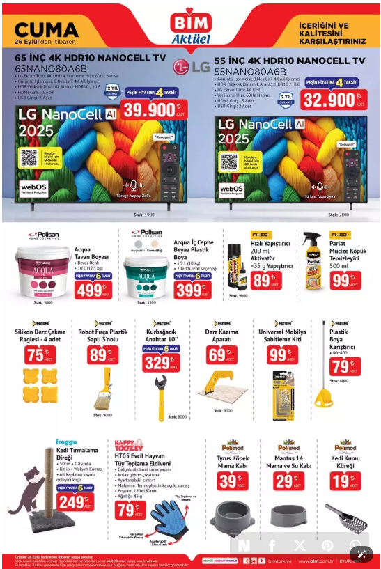 Özetle, BİM’de bu cuma birbirinden çeşitli ürünler tüketicilerle buluşacak. Ankastre setler, televizyonlar, küçük ev aletleri ve kahve makineleri teknoloji ve mutfak kategorisini öne çıkarırken; boya ve tamir malzemeleri evini yenilemek isteyenler için cazip fırsatlar sunuyor. Tekstil kategorisinde ise battaniyelerden pijama takımlarına kadar birçok ürün bulunuyor. Bu haftaki katalog, geniş ürün çeşitliliği ve cazip fiyatlarıyla dikkat çekiyor.