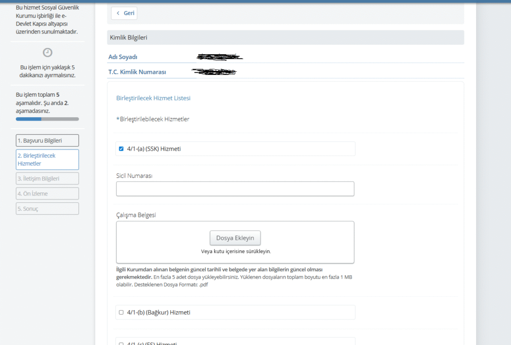 - “Birleştirilebilecek Hizmetler” listesinden, birleştirmek istediğiniz hizmet türlerini işaretleyin. Örneğin, hem SSK hem de Bağ-Kur günlerinizi birleştirecekseniz, 4/1-(a) (SSK) Hizmeti ve 4/1-(b) (Bağ-Kur) Hizmeti kutucuklarını işaretleyin.