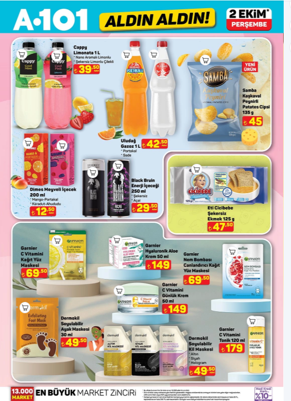 Garnier ve Dermokil markalarına ait cilt bakım ürünleri de 2 Ekim A101 kataloğunda yer alıyor. Yüz maskeleri, C vitamini kremleri, tonikler ve ayak maskeleri uygun fiyatlarla raflarda olacak. Bu ürünler sayesinde cilt bakımına önem veren müşteriler kaliteli ürünlere avantajlı fiyatlarla ulaşabilecek.