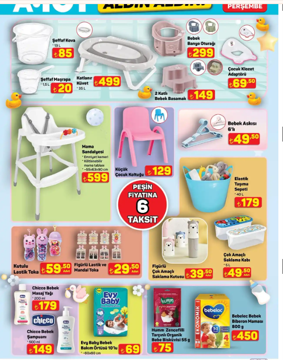 A101’in bu haftaki kataloğunda bebek ve çocuk ürünleri önemli bir yer tutuyor. Bebek banyo oturağı 299 TL’den, mama sandalyesi 259 TL’den başlayan fiyatlarla sunuluyor. Bu ürünler normal fiyatlarına kıyasla neredeyse yarı yarıya indirimli. Çocuk karyolası adaptörü 69 TL, kumaş çocuk karyolası ise 129 TL gibi oldukça uygun fiyatlarla alıcılarını bekliyor.