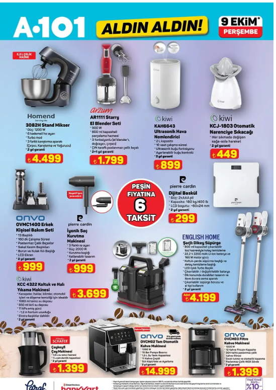 A101, 9 Ekim aktüel ürünler kataloğunda peşin fiyatına taksit imkanı da sunuyor. Birçok üründe 6 taksite varan ödeme kolaylığı bulunuyor. Bu da bütçe dostu alışveriş yapmak isteyenler için önemli bir avantaj sağlıyor.