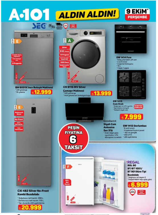 A101’in 9 Ekim kataloğunda beyaz eşya severler için de sürprizler var. BM 6001X Inox bulaşık makinesi 12.999 TL’ye, CM 9115 INV silver çamaşır makinesi ise 13.999 TL’ye satışa sunuluyor. Bu ürünlerde 1000 devir kapasitesi gibi üst düzey özellikler oldukça uygun fiyatlara sunuluyor.